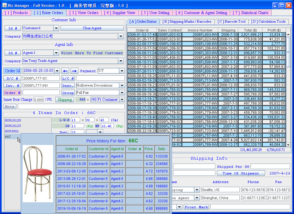 Biz_Manager is a Java program that lets you enter, maintain and print product and supplier info. You can enter orders, it will automatically calculate and generate sales contracts, attachments, invoices, packing lists and shipping documents. You can watch the animated images of Biz_Manager to see how the program works. But best of all , you can try it before you buy it !