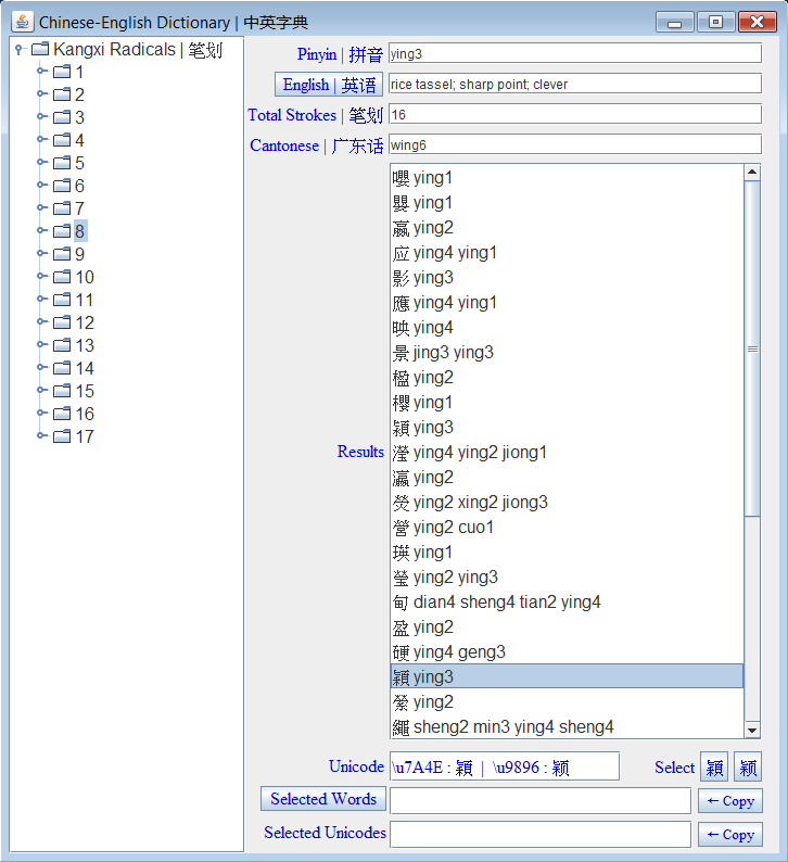 Chinese_English_Dictionary is a Java program that lets you find Chinese characters by pin yin, English or strokes. But best of all , you can try it before you buy it !