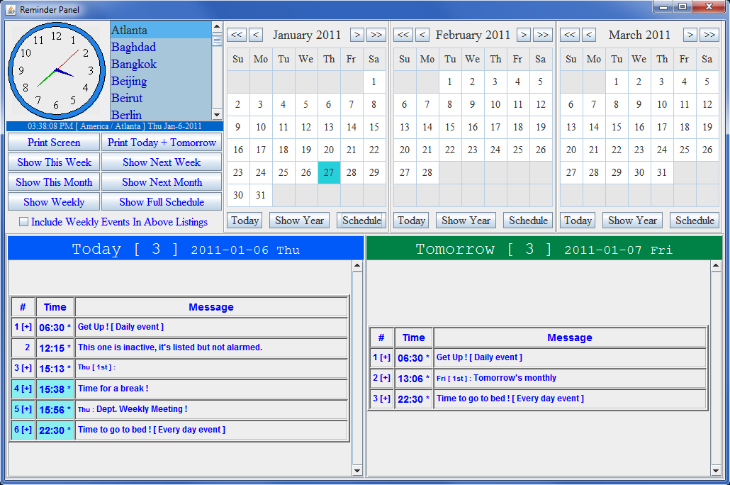 Reminder_Panel_Pro is a Java program that combines calendar, world clock, scheduler and alarm, it can use wildcards for time like this : 2011-01-28 X:30 , 2012-X-01 10:50 or Wed [ Last ] X:01. Able to record your voice and playback your recording on time. But best of all , you can try it before you buy it !